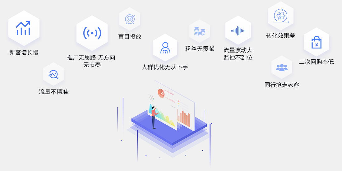 基于行业、店铺及商品数据分析,通过搜索营销工具、展示营销工具、内容营销工具,利用达摩盘、营销策略中心、数据银行等人群数据管理平台,为商家提供可确定性的效果营销服务。