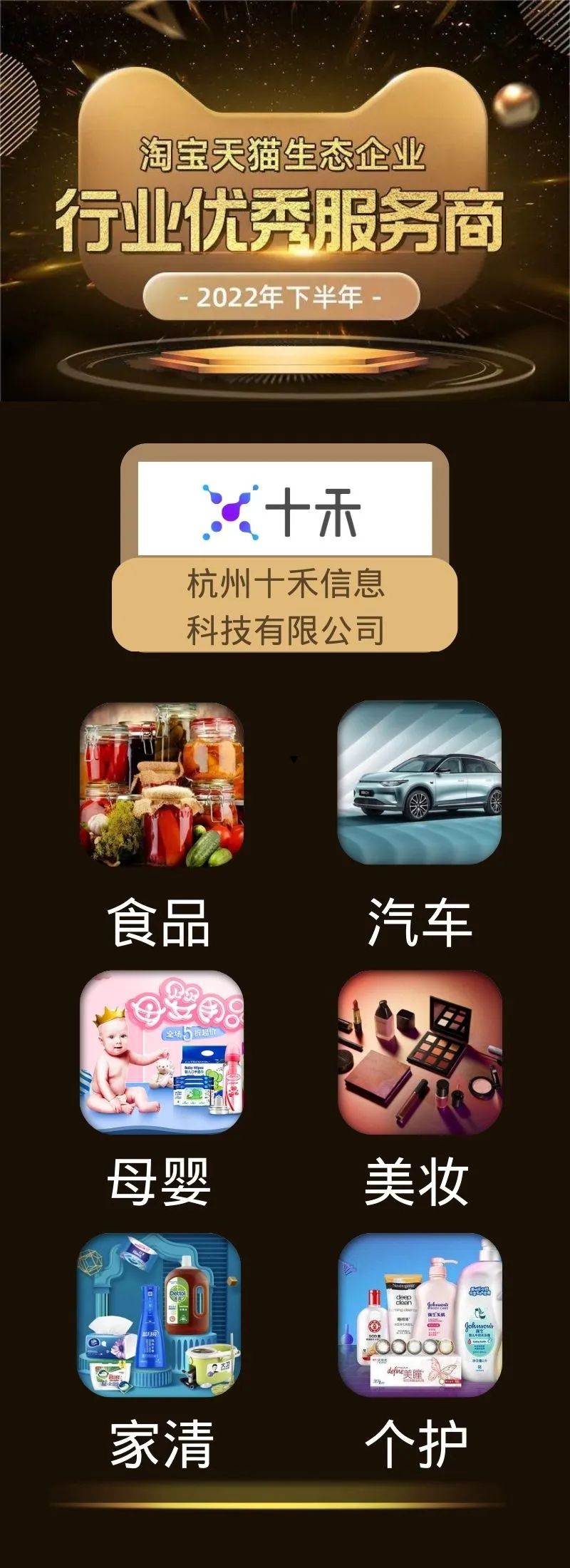 杭州十禾获“五星级服务商”荣誉,同时在食品、汽车、美妆、母婴、个护、家清共六个行业荣获行业优秀服务商荣誉。
